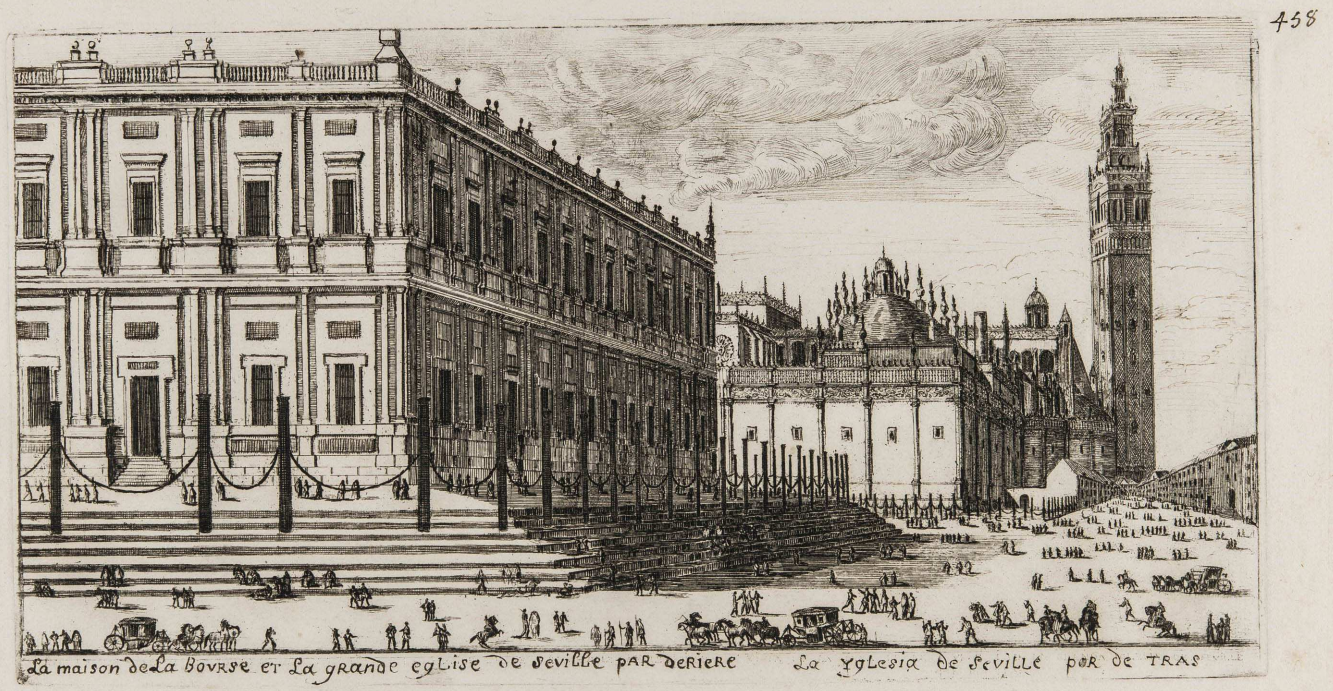 Grabado: Casa de Contratación Sevilla, Iglesia Catedral al fondo, Biblioteca Nacional de España.